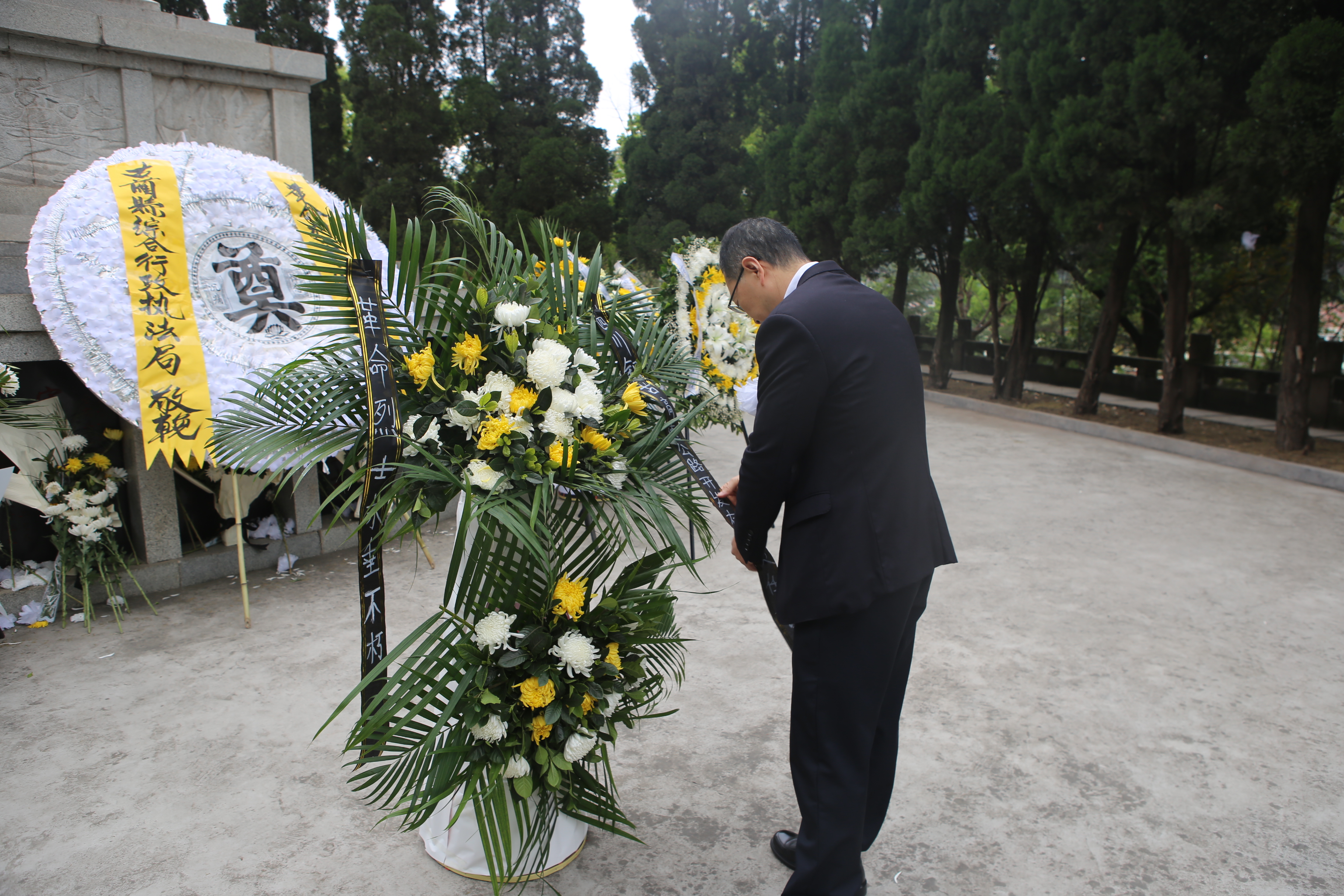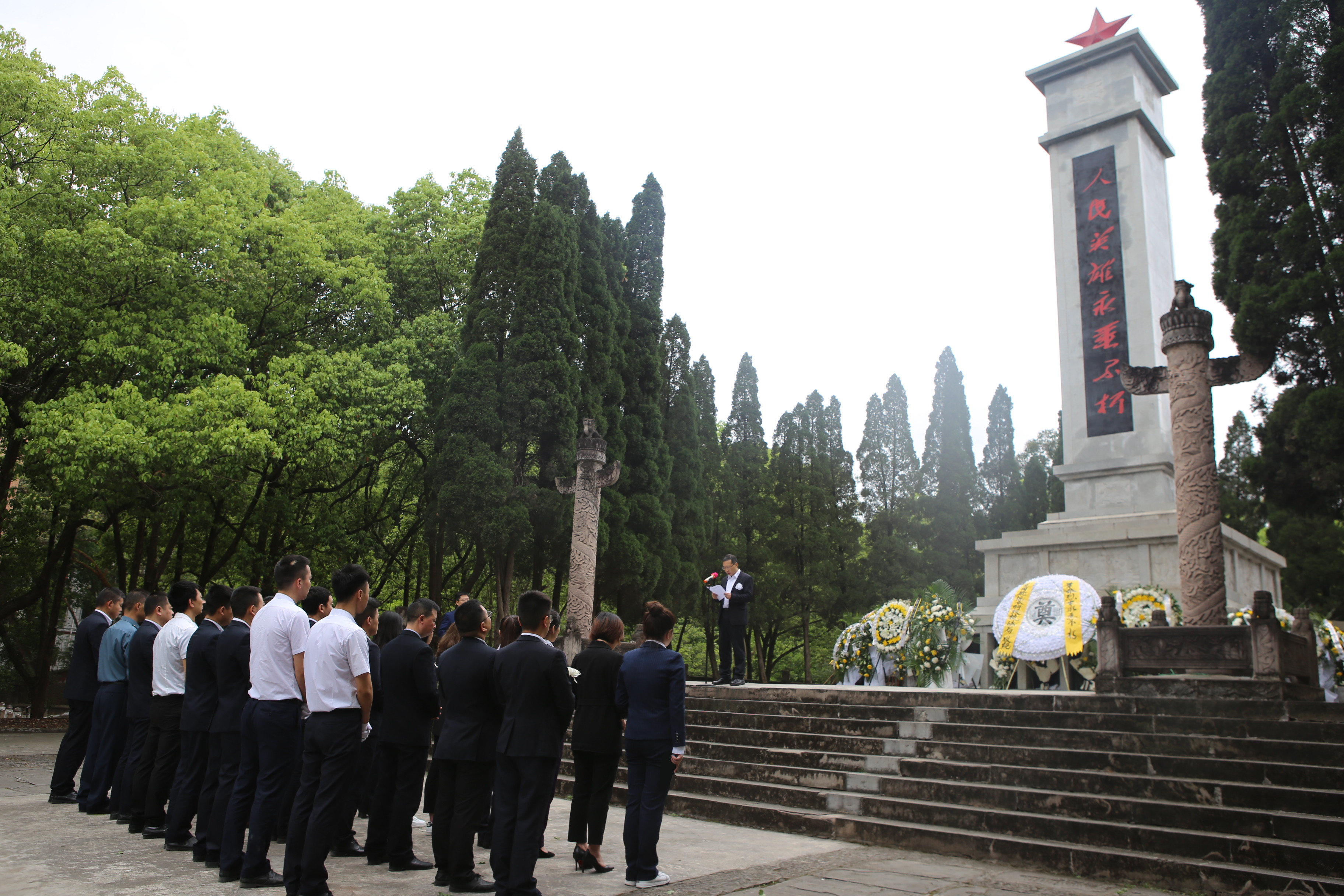 烈士墓前,在公司黨委副書記、總經(jīng)理喬勝俊的主持下,黨員干部們在紀念碑前齊聲合唱《義勇軍進行曲》、聆聽烈士英雄事跡、為英烈默哀,最后黨委書記、董事長劉小波與兩名黨員代表一起為英烈敬獻花籃、整理挽聯(lián),寄托大家對先烈的緬懷和哀思。