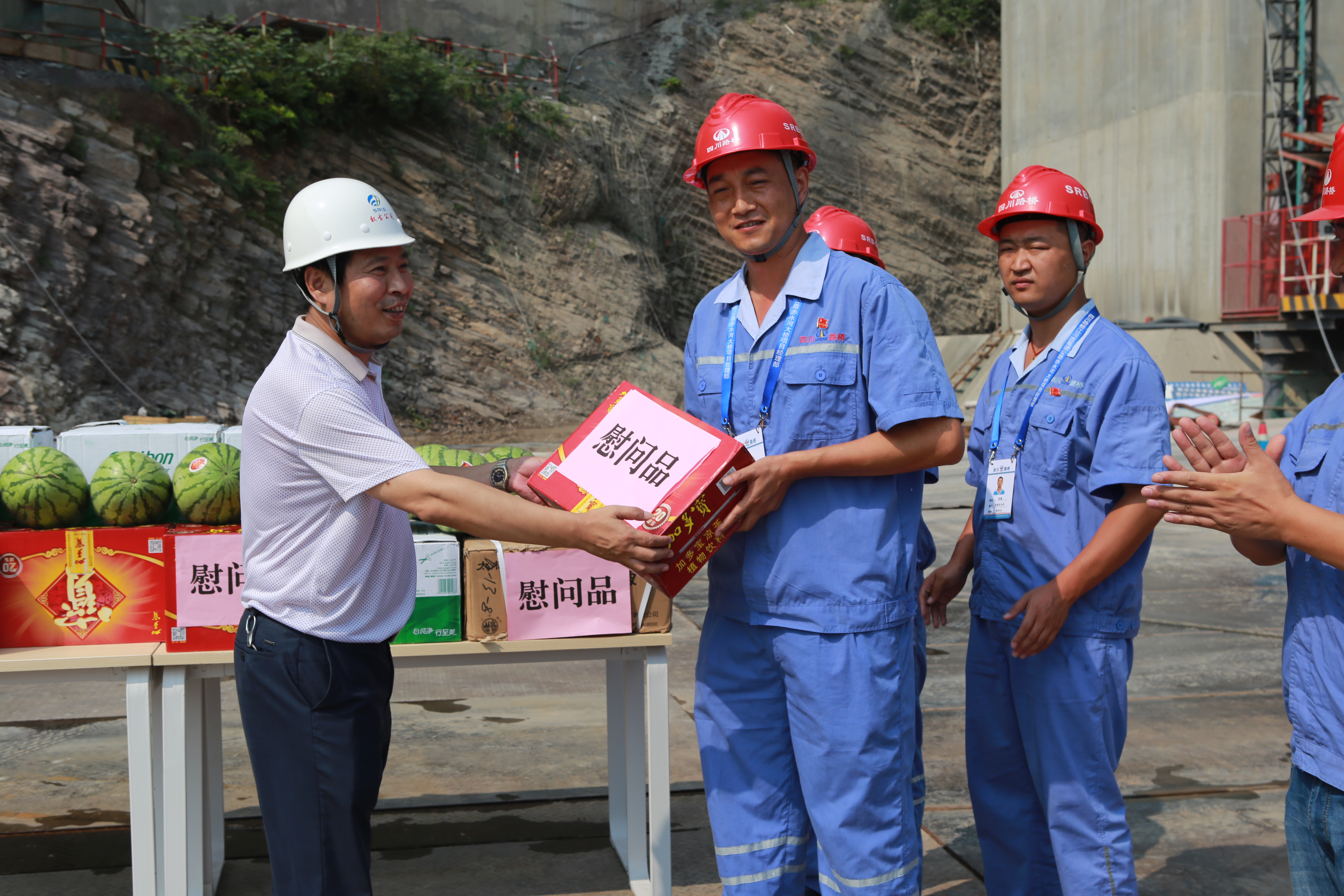 李興明主席(左一)為一線建設(shè)者送上清涼用品