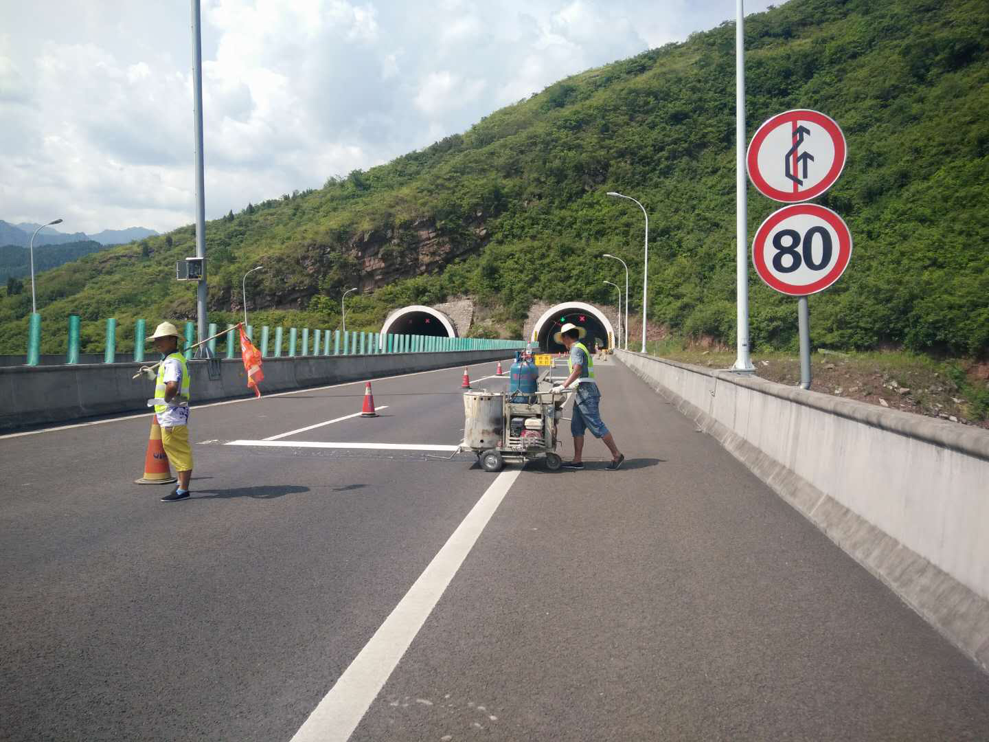 在公司領(lǐng)導的大力支持下,工程養(yǎng)護處同相關(guān)單位積極協(xié)調(diào),對公司運營路段所有隧道進行了全面排查,并根據(jù)新的公路交通安全設施設計規(guī)范(JTG D81-2017),編制隧道進出口交安設施提升改造方案。在路產(chǎn)管護大隊的積極配合下,于8月1日組織養(yǎng)護單位對不符合新規(guī)范要求的現(xiàn)象進行升級改造。重點補充施劃不滿足現(xiàn)行規(guī)范的橫向振動減速標線、延長車道分界線交通,在橋隧相接處增設TA級防撞墊、路隧相接處增設砼護欄及其它路段逐級減速標志。工程完工后,將極大的提高隧道進出口的行車誘導功能和安全防護功能,有力保障運營道路的安全運行。