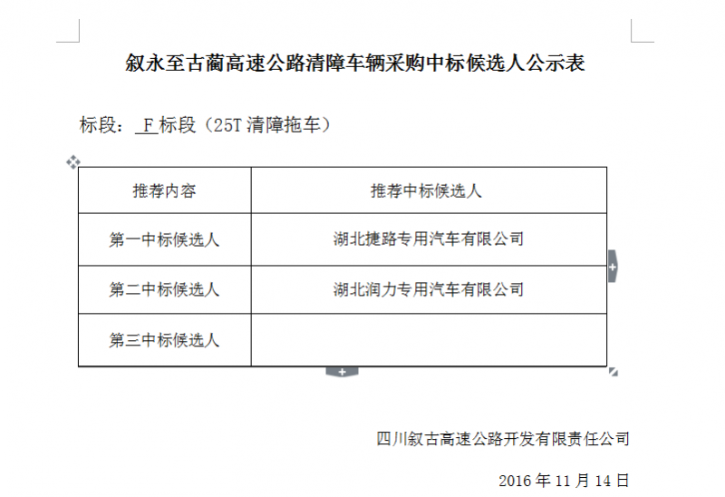 敘永至古藺高速公路清障車輛(F標(biāo)段)采購(gòu)中標(biāo)候選人公示表