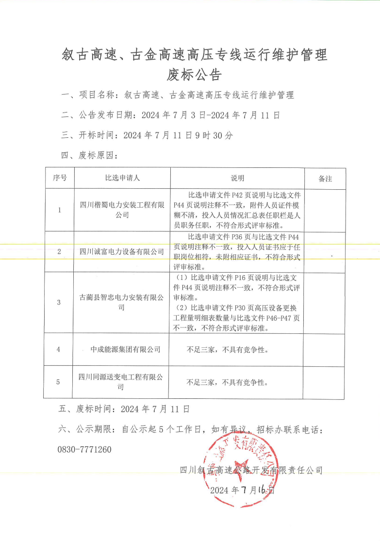 敘古高速、古金高速高壓專線運(yùn)行維護(hù)管理廢標(biāo)公告
