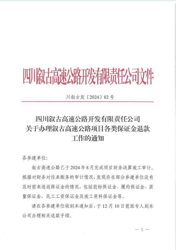 敘古公司關(guān)于辦理敘古高速公路項(xiàng)目各類保證金退款工作的通知