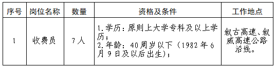 根據(jù)敘古敘威公司一線運(yùn)營(yíng)管理工作需要,擬面向蜀道集團(tuán)系統(tǒng)開(kāi)展收費(fèi)崗位內(nèi)部選聘工作?,F(xiàn)將相關(guān)事宜公告如下: