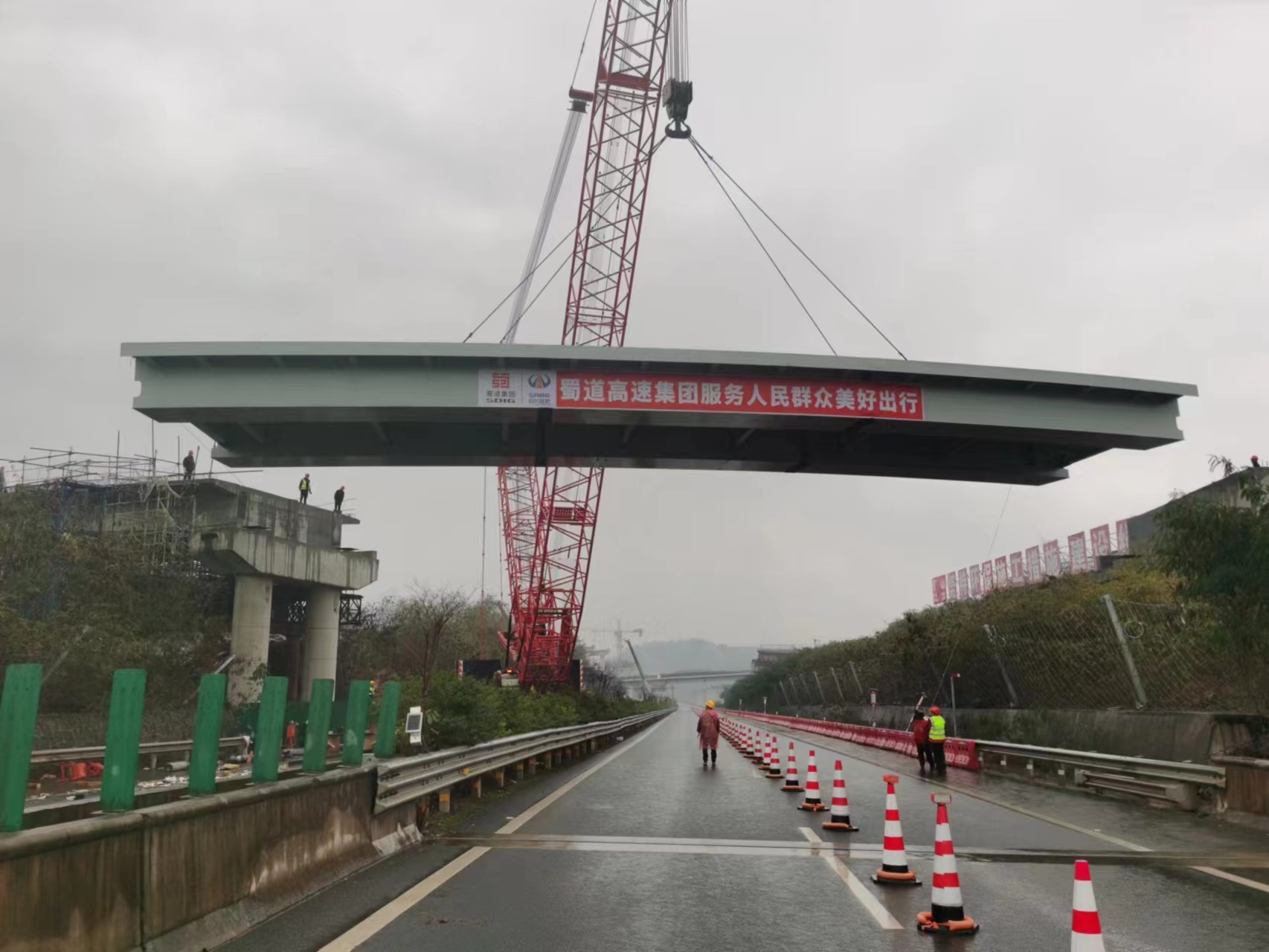 為克服以上困難,參建單位精心組織,多措并舉:一是協(xié)調(diào)各方,斷道施工。參建單位積極與高速公安、高速執(zhí)法等相關(guān)單位進(jìn)行聯(lián)系,實(shí)行敘古高速全幅斷道,并利用其半幅路基拼裝,單幅雙向通行,充分保證施工安全進(jìn)行。二是反復(fù)勘探現(xiàn)場(chǎng),專題研討方案。參建單位聯(lián)合“一路三方”代表多次到現(xiàn)場(chǎng)踏勘,確定封道時(shí)間、變道口位置并組織專題會(huì)議探討吊裝方案,細(xì)化吊裝組織,確保鋼箱梁順利吊裝就位。三是加強(qiáng)安全技術(shù)交底,明確責(zé)任分工。吊裝前多次組織召開(kāi)安全、技術(shù)交底會(huì),明確分工、細(xì)化職責(zé)、責(zé)任到人,重點(diǎn)明確關(guān)鍵環(huán)節(jié)和工序的施工要點(diǎn)。在吊裝過(guò)程中,強(qiáng)化現(xiàn)場(chǎng)安全管控,吊裝作業(yè)指令執(zhí)行有序,各工序銜接順暢,嚴(yán)格作業(yè)過(guò)程質(zhì)量把控。